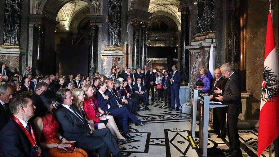 Президент России Владимир Путин и его австрийский коллега Александр Ван дер Беллен приняли участие в открытии выставки работ Эрмитажа в Музее истории искусств в Вене.