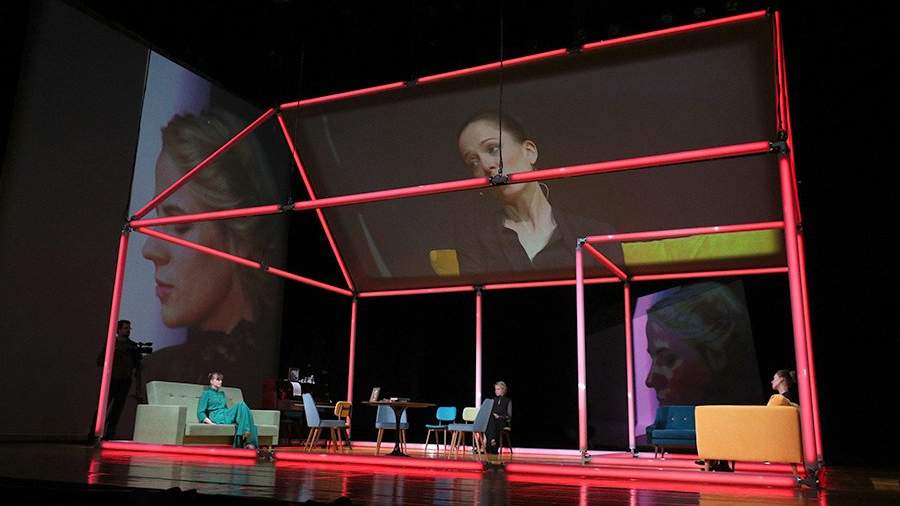 Сценическое пространство огорожено неоновыми трубками, в очертаниях которых угадываются дом и крыша (сценограф Лариса Ломакина). Внутри расставлены диваны и стулья. Перемещений — минимум. Вошел, сел, прочел, встал, ушел. Или переместился на другой диван. Из разнообразящих действие элементов — два оператора, снимающих чтецов крупным планом (изображение проецируется на три экрана — в центре, слева и справа), любовная сцена Маши и Вершинина (Дмитрий Куличков) и музыкальные паузы. Блюз My heart belongs to daddy Коула Портера отмечает границы актов. Шлягер из репертуара Андрея Державина «Давайте выпьем, Наташа, сухого вина» звучит в исполнении Тузенбаха, ради такого случая поменявшего диван на фортепиано.