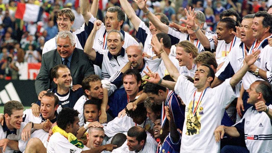 Французская cборная  празднуют вместе с тренерами. Титул чемпиона мира выиграли с победой 3:0 в финале над Бразилией на Stade de France в Сент-Дени, Франция, 1998 год