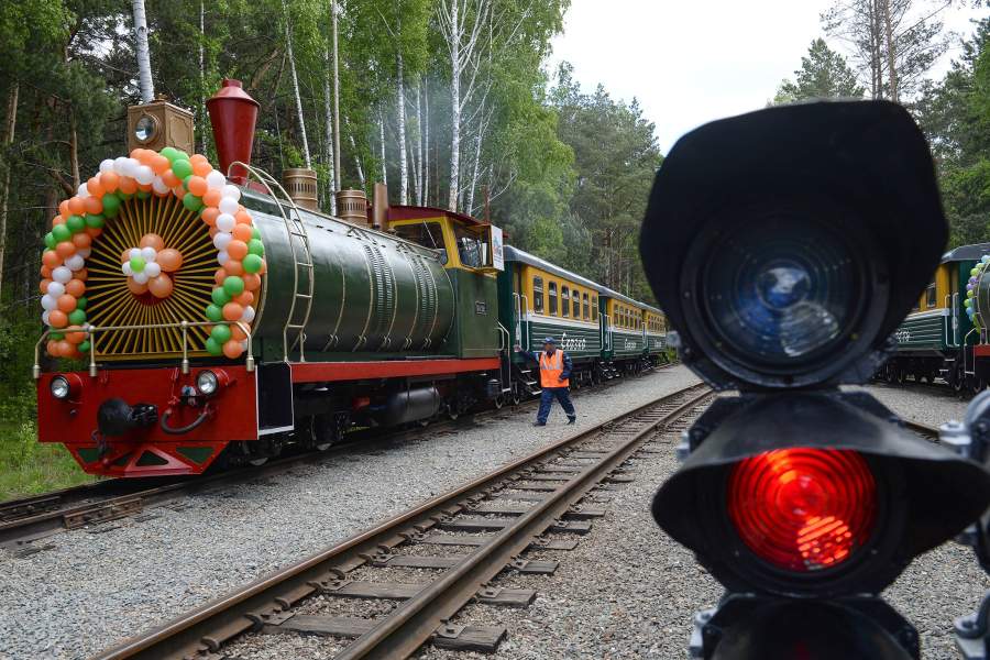 Поезд на станции Спортивная детской железной дороги в Новосибирске перед церемонией открытия сезона движения поездов. 2016 год