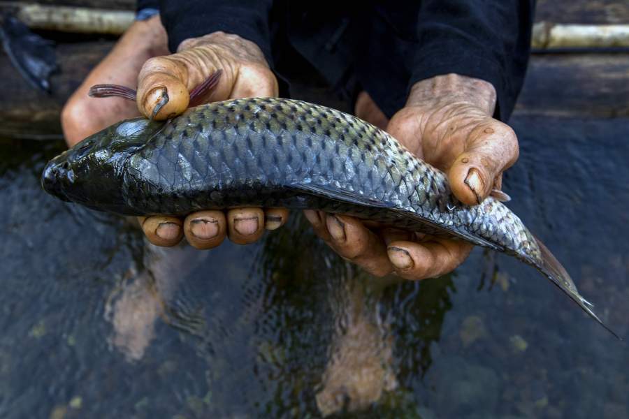 Переносят бакланов к месту рыбалки в специальных деревянных корзинах