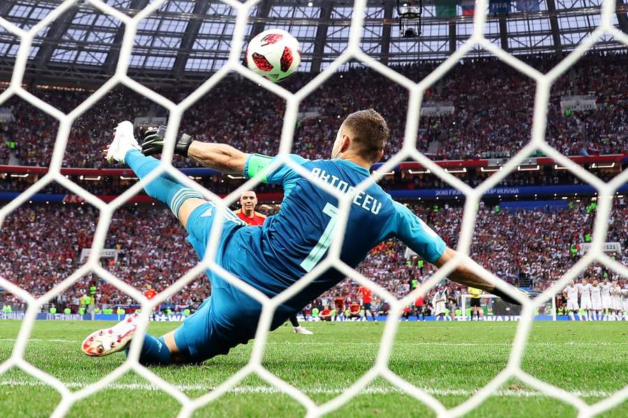 Вратарь Игорь Акинфеев отбивает мяч в серии пенальти