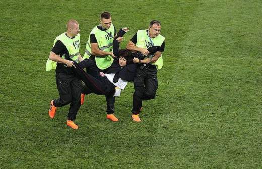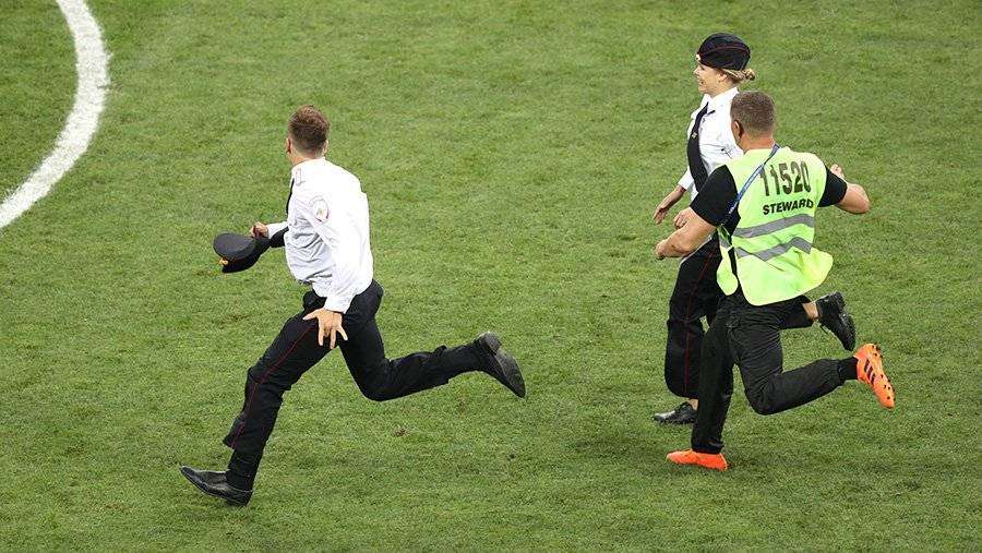 На 52-й минуте на поле выбежали три женщины и мужчина в полицейской форме. Они были оперативно выпровожены с газона охраной, однако игру всё равно пришлось прервать на две минуты. Позже в Сети появилось видео их допроса.