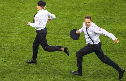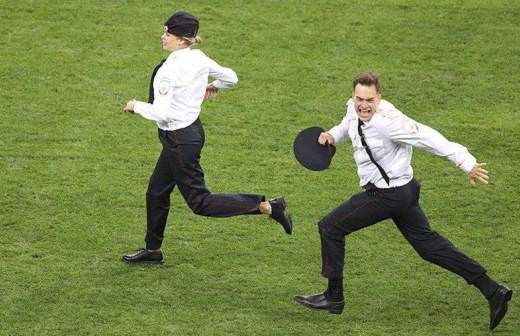 На 52-й минуте финальной игры мирового первенства по футболу на поле выбежали три женщины и мужчина в полицейской форме. Они были оперативно выпровожены с газона охраной, однако игру прерывали на две минуты.