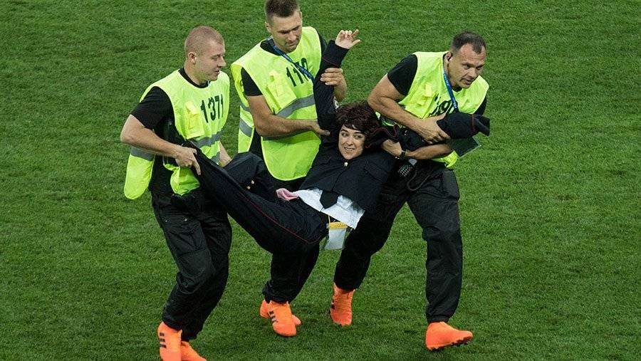 Четверо участников Pussy Riot выбежали на поле стадиона «Лужники» во втором тайме финального матча между сборными Франции и Хорватии. Активистов задержали сотрудники охраны, после чего выпроводили с газона. Из-за инцидента матч пришлось прервать на две минуты.