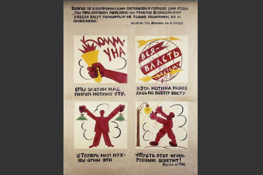Задачей сатирических плакатов было не только высмеять врагов революции, но и поддержать начинания молодой республики. Плакат «Окна РОСТА» № 742 Маяковского посвящен лампочкам Ильича, цитате Ленина: «Коммунизм есть Советская власть плюс электрификация всей страны»
