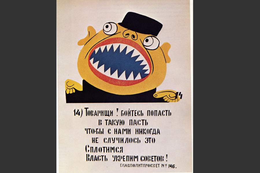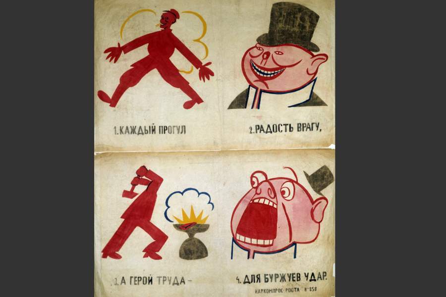 Острое восприятие Октябрьской революции отразилось не только в поэзии Владимира Маяковского. Поэт создает наглядную рекламу новой жизни и коммунизму во время Гражданской войны. На фото: репродукция агитационного плаката № 858 «Каждый прогул — радость врагу, а герой труда — для буржуев удар» из серии «Окна сатиры РОСТА» (1919–1921 годы)