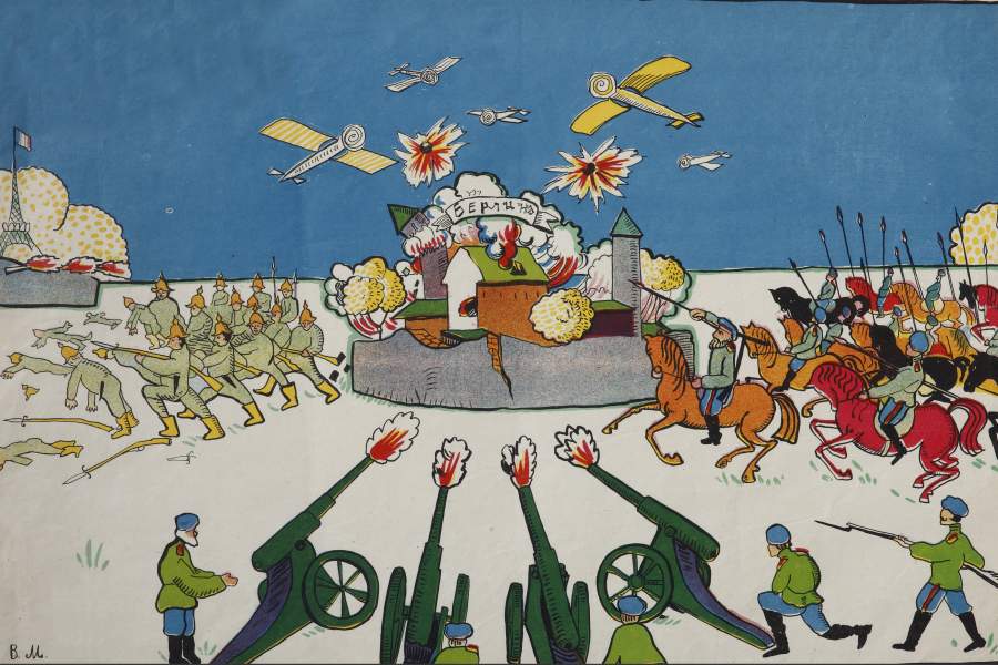 Знаменитые «Окна РОСТА» были уже работами опытного Маяковского-художника. Но первые шаги в жанре плаката поэт сделал в годы Первой мировой войны, создавая военные лубки. На фото: плакат «Эх ты немец», 1914 год, сопровождавшийся следующими строчками автора: «Эх ты немец, при да при же. Не допрешь, чтоб сесть в Париже. И уж братец клином клин — ты в Париж, а мы в Берлин»
