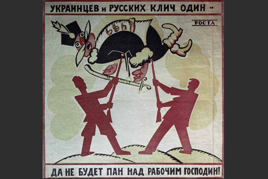 Плакат из серии «Окна сатиры РОСТА» работы В. Маяковского «Украинцев и русских клич один — да не будет пан над рабочим господин!», 1920 год