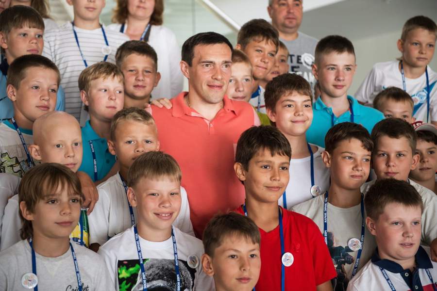 Звезда фотографируется с юными хоккеистами перед церемонией открытия Всероссийского детского спортивно-оздоровительного центра, который начал работу на базе Малой ледовой арены «Шайба» в Сочи