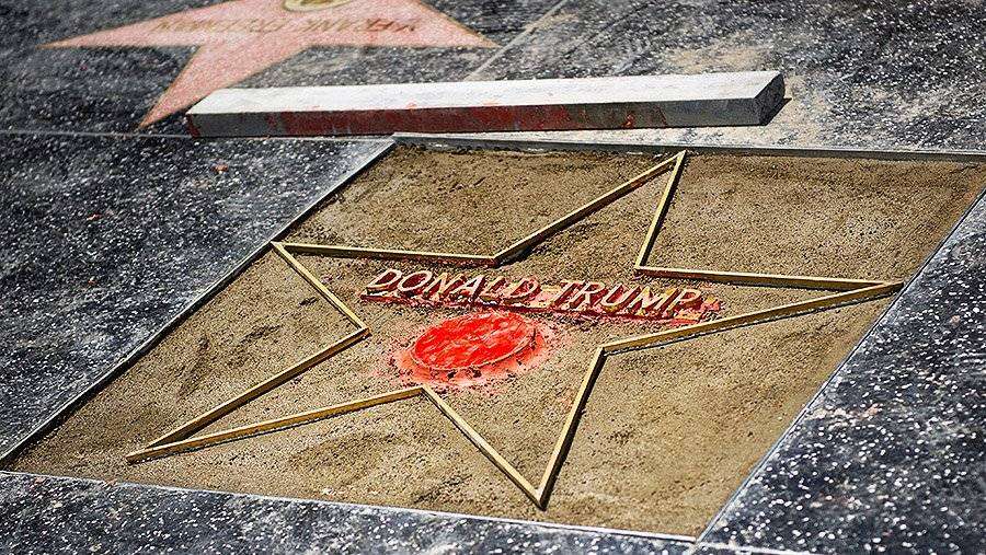 В Сети появилось видео, на котором три человека с флагом России в руках стоят около звезды президента США Трампа на Аллее Славы в Голливуде.