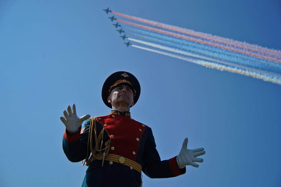 Дирижер военного оркестра во время пролета штурмовиков Су-25