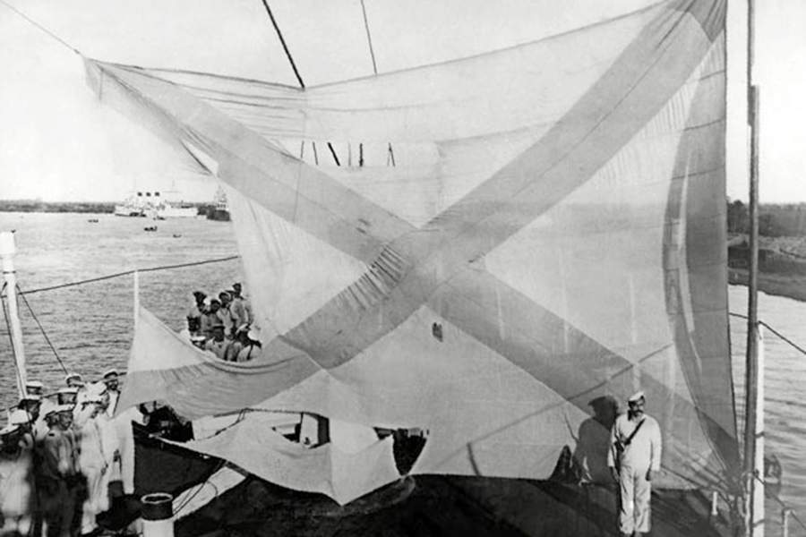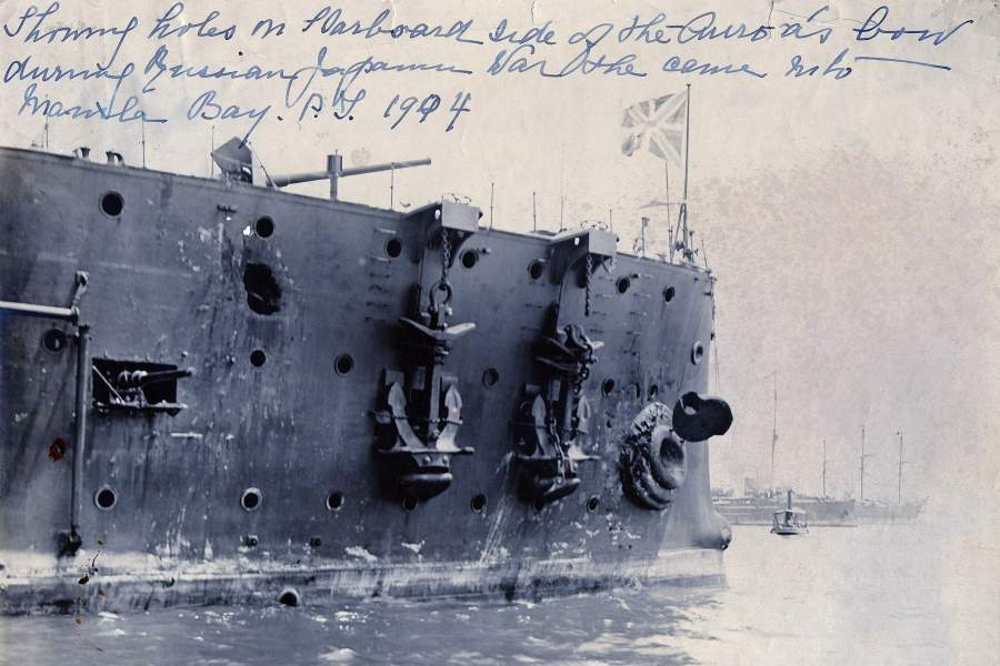 Вскоре после спуска на воду, в 1905 году, «Аврора» в составе Тихоокеанской эскадры приняла участие в Цусимском сражении. Во время боя повреждения получил не только сам корабль, но и кормовой Андреевский флаг — его шесть раз сбивали осколки снарядов, но каждый раз команда поднимала флаг вновь. На фото — кормовой флаг вечером после сражения