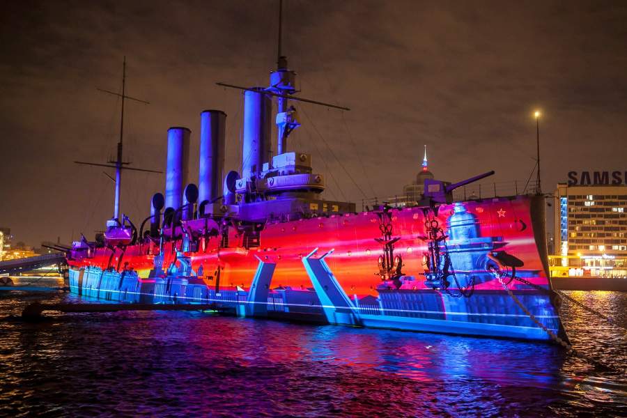 Крейсер «Аврора» у Петроградской набережной в ноябре 2017-го, во время Фестиваля света, посвященного 100-летию революции 1917 года