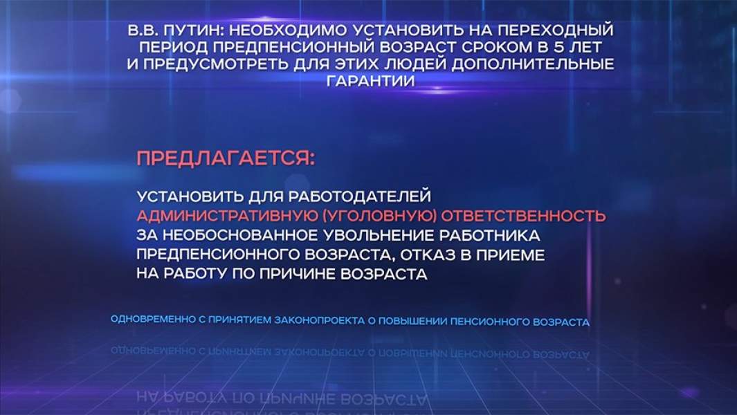 Кроме того, мы много говорили о том, что должен быть комплексный подход, который обеспечивает меры по обеспечению занятости и необходимого медицинского обслуживания. Эта тема тоже очень важная, и замечательно, что это прозвучало в обращении президента. Люди говорят — мы готовы работать, но была бы работа и здоровье. И вот теперь люди предпенсионного возраста смогут проходить ежегодную диспансеризацию, им будет предоставляться время для ежегодной диспансеризации, это очень важно. И наконец, люди должны быть заняты и уверены в том, что есть работа, и если ее нет, то тут необходимо увеличение пособия по безработице. Президент предложил повышение пособия почти в два раза, и я думаю, что это как раз те меры, которые помогут смягчить накопившийся негатив по отношению к этой реформе».