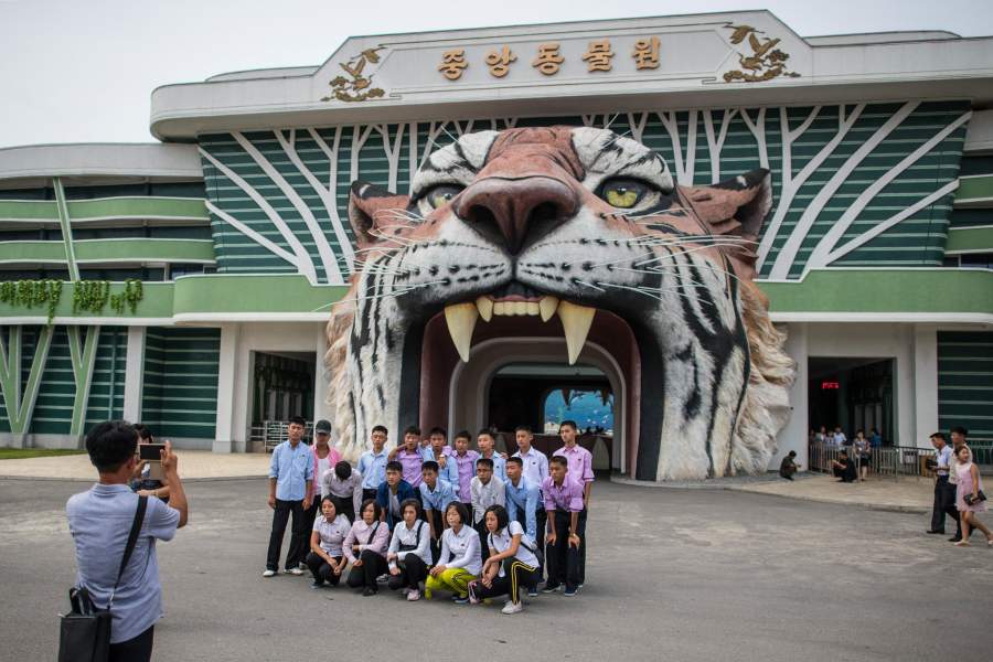 Группа корейцев фотографируется перед входом в Пхеньянский центральный зоопарк. Никто из местных жителей ни разу не обратил внимания на фотографа. «Никакого взаимодействия — ни словами, ни жестами, — никто на меня не смотрел. Как будто меня там не было. Это было очень странно. Но мне нравятся эти снимки. Они передают атмосферу удрученности и странности»