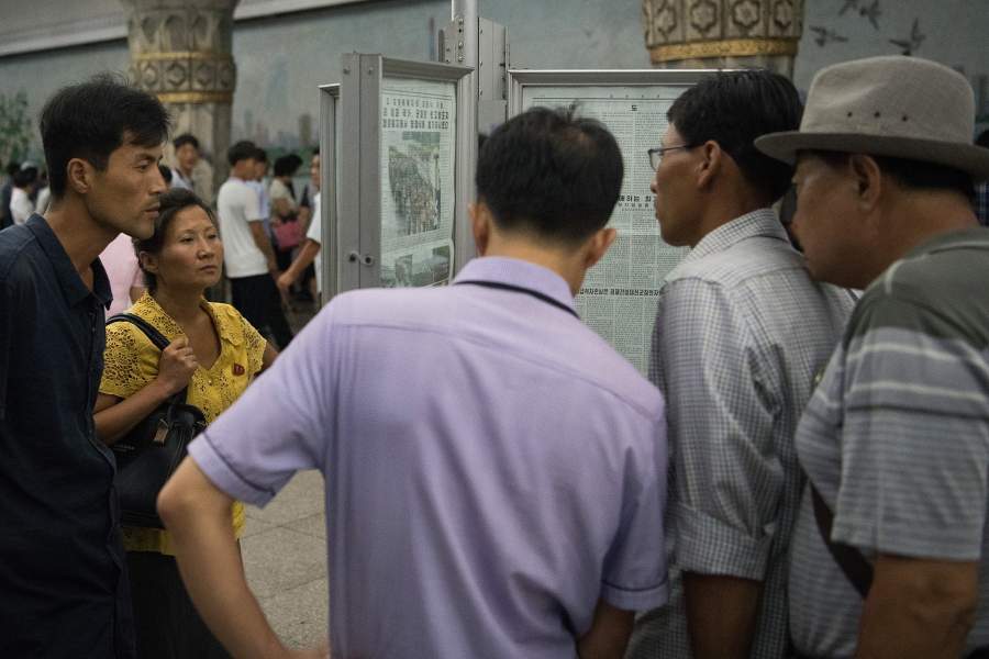 Фотограф хотел отправиться в отдаленные уголки страны, но его туда не пустили. Единственная отдаленная поездка — к месту, где годами хранят все подарки национальному лидеру, в паре часов езды от Пхеньяна. Снять там ничего не позволили. На фото: пассажиры метро читают газету на станции