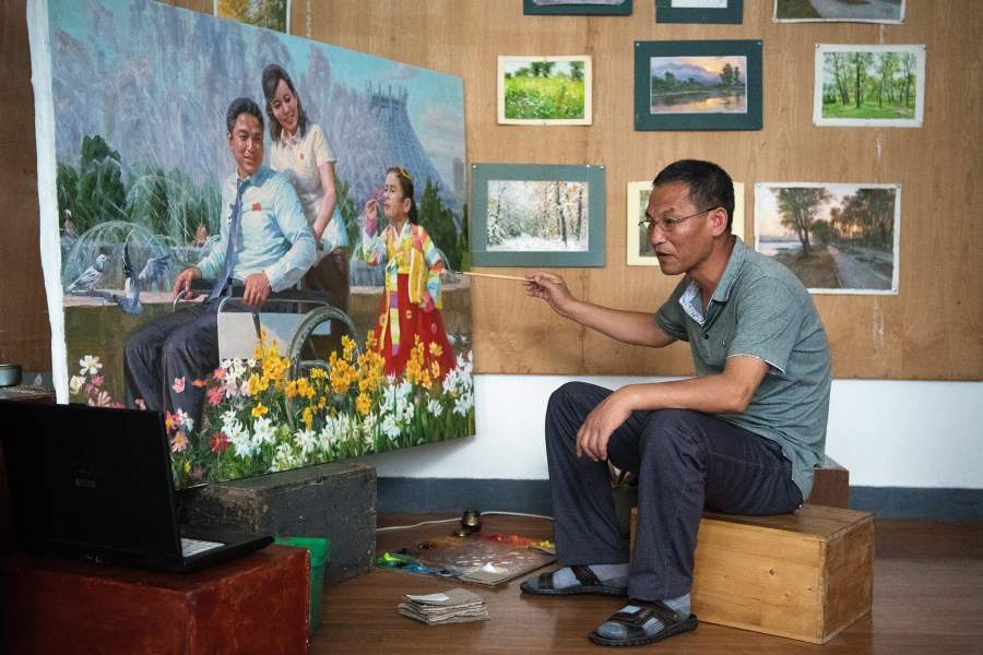 Художник Жон Йонг Гук работает над картиной в своей студии в столице Северной Кореи