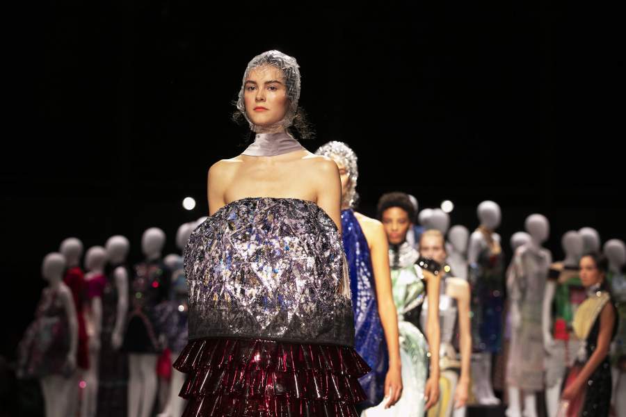Бывший креативный директор Givenchy Джулиен Макдональд представил смелые вечерние платья, напоминающие скорее купальные костюмы. В показе приняла участие известная модель Винни Харлоу