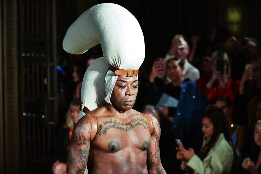 На показе Пэм Хогг по подиуму дефилировали татуированные и украшенные боди-артом модели с перетянутыми ремнями конечностями