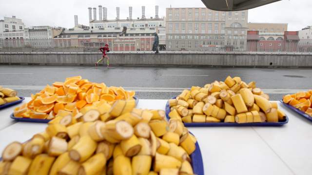 Организаторы подготовили для участников 9 т бананов, 3,5 т яблок и почти столько же апельсинов. Бегунам предоставили 85 тыс. л воды, 4 тыс. л изотоника (специальный напиток для атлетов. — «Известия») и 16 тыс. л безалкогольного пива.