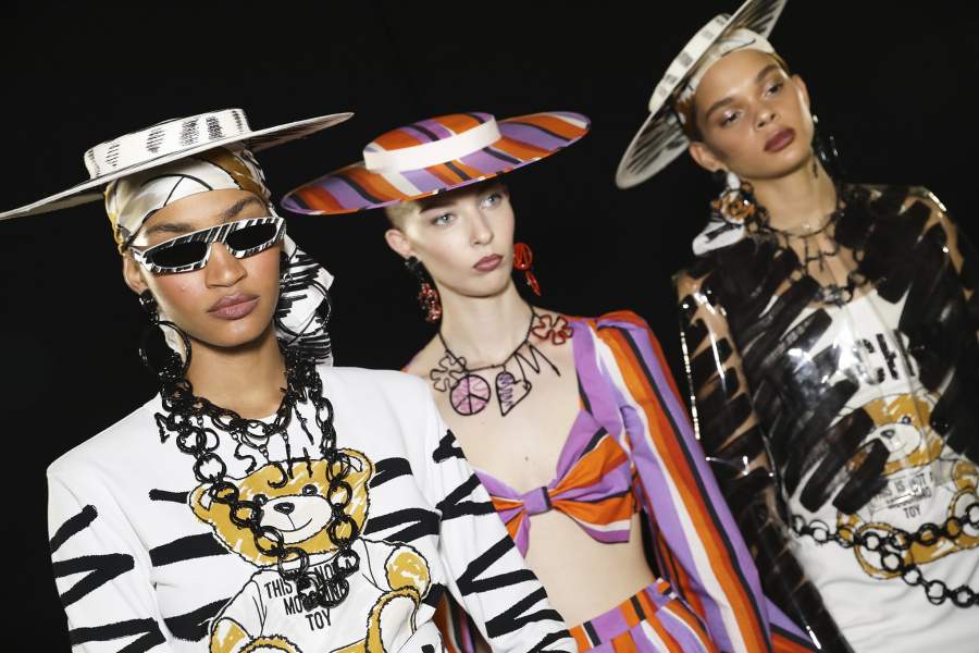 Бренд Moschino смело соединил крой в стиле 1960-х с яркими принтами, напоминающими об эпохе расцвета MTV