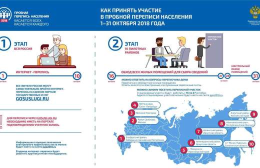 Пробная перепись будет проходить с 1 по 31 октября 2018 года и охватит порядка 550 тыс. человек. Ее цель — отработка организационных и технологических вопросов Всероссийской переписи населения 2020 года с учетом применения новых способов сбора сведений о населении в электронном виде.