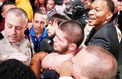 После завершения боя в зале T-Mobile арены стало не менее жарко, чем в октагоне. Перебравшись серез сетку, Хабиб ввязался в драку с выполнявшим роль углового профессиональным бойцом Дилоном Дэисом. На видеозаписи из зала видно, что тренер Макгрегора после окончания боя что-то кричал россиянину. Вообще Конор и его команда постоянно провоцировали Хабиба, затрагивали очень тонкие темы — родителей и религию. Самым жестким ответом со стороны нашего бойца в этой перепалке стало слово «курица» в адрес ирландца.