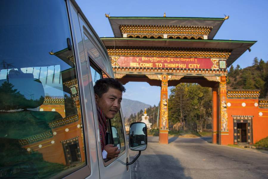 Так выглядит въезд в город Тхимпху, столицу Бутана, население которой составляет чуть менее 100 тыс. человек. Всего в Бутане живут около 700 тыс. человек. Сами они называют свою родину Страной дракона