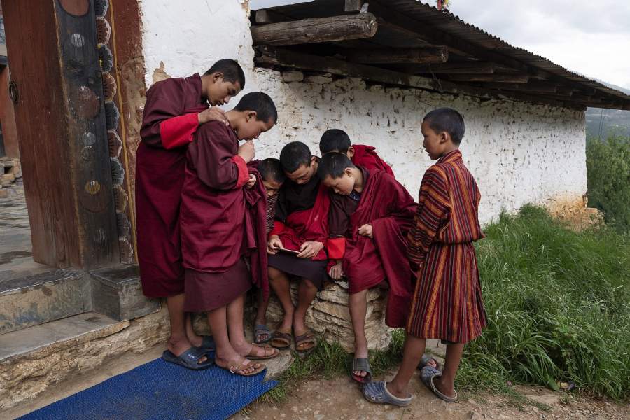 Молодые монахи со смартфоном смотрят телевизионную передачу, собравшись у стен монастыря — в его пределах развлечения запрещены