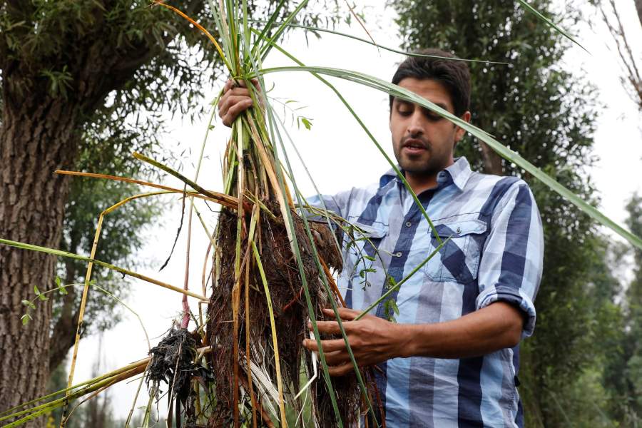 Люди выкашивают траву, которой поросли берега канала, чтобы создать комфортную среду для аксолотлей