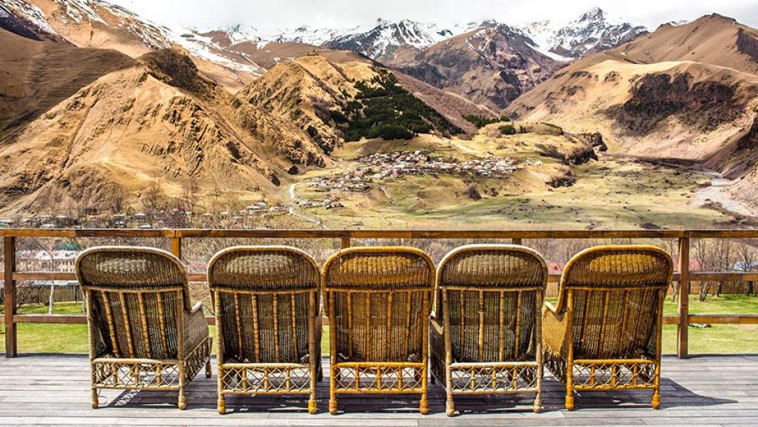 Казбеги, или Степанцминда — первый крупный населенный пункт после российской границы. Ну как крупный — 1,3 тыс. жителей. Зато самый крутой отель в Грузии и чуть ли не мире. По крайней мере, Conde Nast Traveler в прошлом году назвал Rooms Hotel Kazbegi одним из 10 лучших видовых отелей мира. Виды тут и правда первосортные: величественный Казбек, березки, где-то там внизу небольшие домики Степанцминды, а вверху — Троицкая церковь.