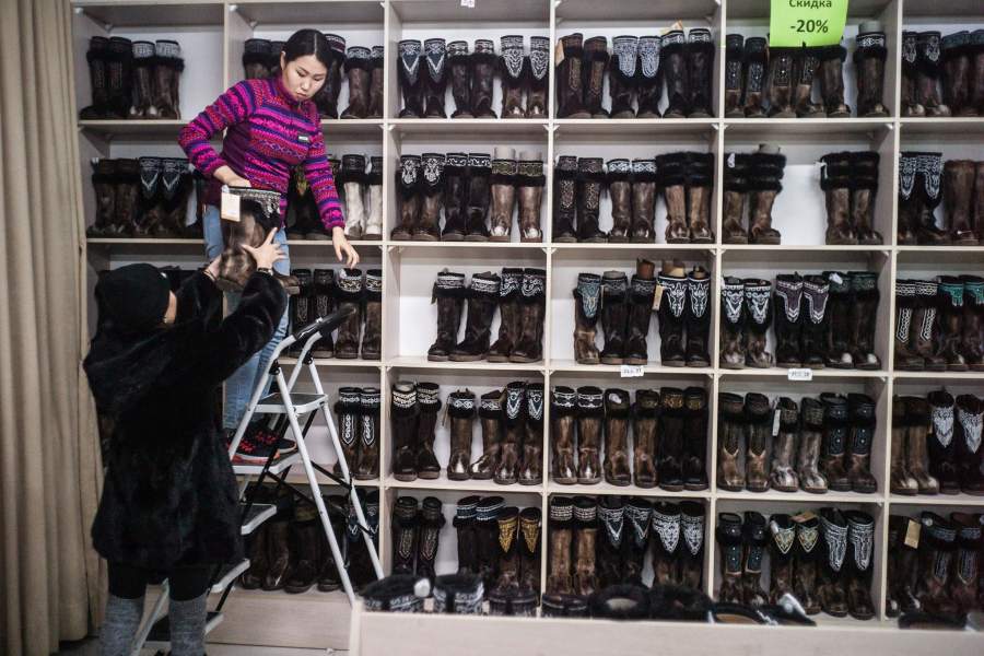 Правда, и одеваются местные жители соответственно. Унты на оленьем меху — традиционная и по-прежнему популярная у якутов обувь