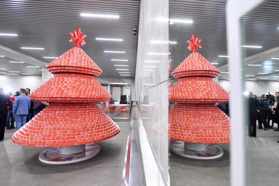 На станции метро «Тургеневская» установили елку более чем из 230 тыс. использованных проездных билетов