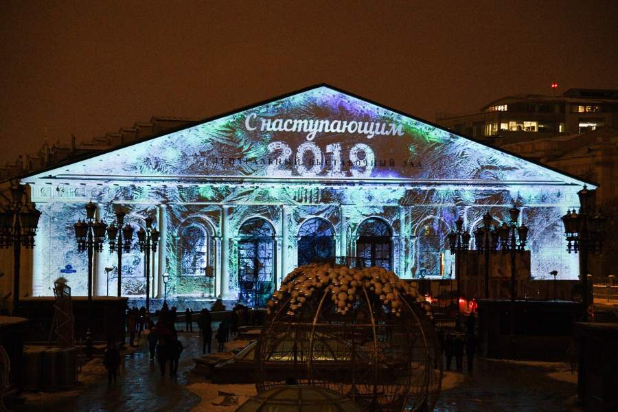 На фасаде Центрального выставочного зала «Манеж» проходит показ световых шоу «Новогодняя Москва» и «Путешествие в Рождество»