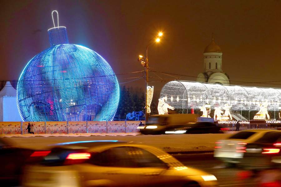 Светящийся елочный шар у станции метро «Парк Победы». Также на Поклонной горе установлена новинка этой зимы — музыкальный тоннель