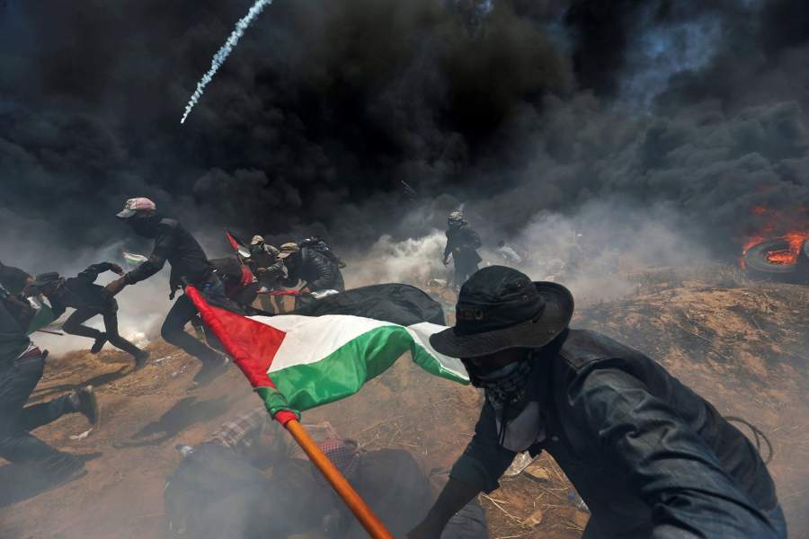 Палестинские демонстранты укрываются от огня израильских военнослужащих во время Великого марша возвращения — масштабной протестной акции, которая состоялась на границе между сектором Газа и Израилем весной 2018-го