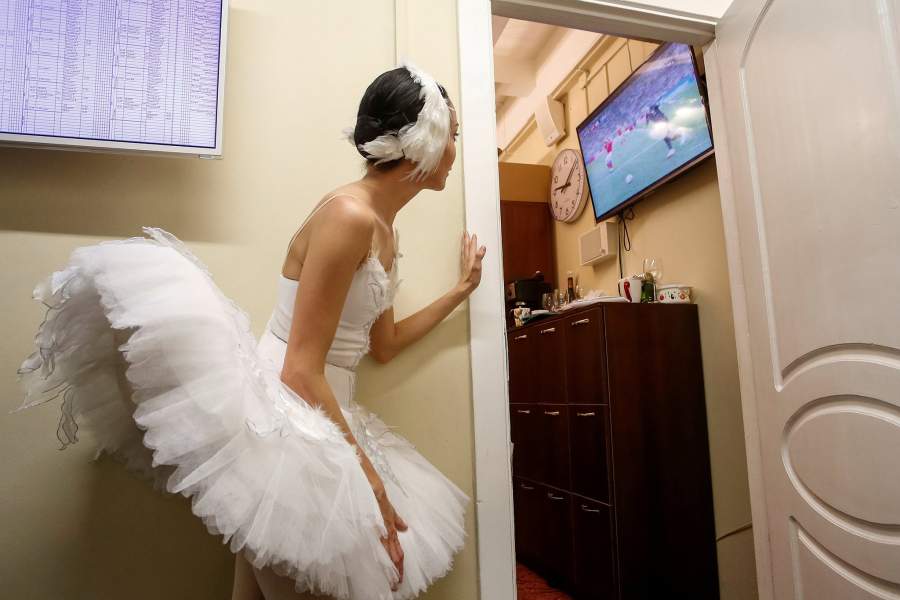 Балерина Михайловского театра в Петербурге наблюдает за ходом игры между сборными командами России и Хорватии в рамках четвертьфинала чемпионата мира по футболу