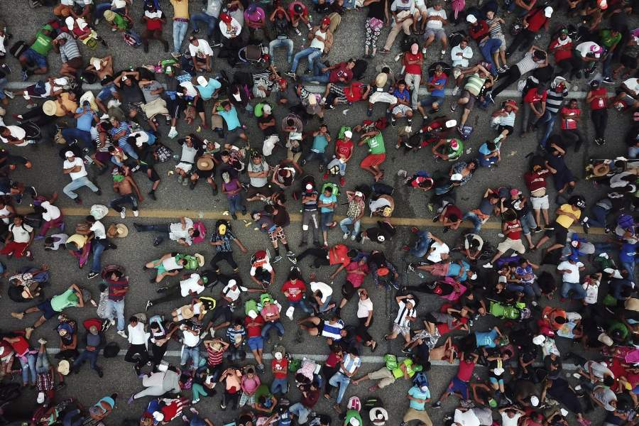 Участники каравана беженцев во время отдыха по пути к границе Мексики и Соединенных Штатов — караван, к которому присоединились несколько тысяч человек, начал двигаться из Гондураса осенью 2018-го