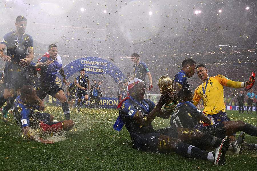 Игроки сборной Франции во время церемонии награждения после победы над командой Хорватии в финальном матче чемпионата мира по футболу – 2018. Игра проходила на стадионе «Лужники»
