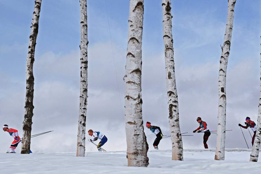 Ханс Кристер Холунн (Норвегия), Бурман Йенс (Швеция), Йонас Доблер (Германия), Дарио Колонья (Швейцария) и российский спортсмен Андрей Ларьков проходят дистанцию масс-старта на 50 км классическим стилем в соревнованиях по лыжным гонкам среди мужчин на XXIII зимних Олимпийских играх