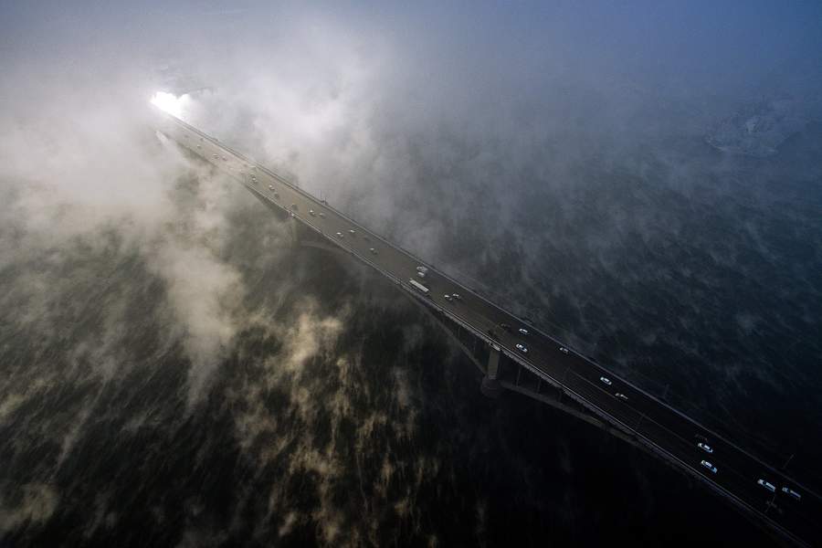 Вид на Коммунальный мост через реку Енисей в Красноярске во время ноябрьских морозов