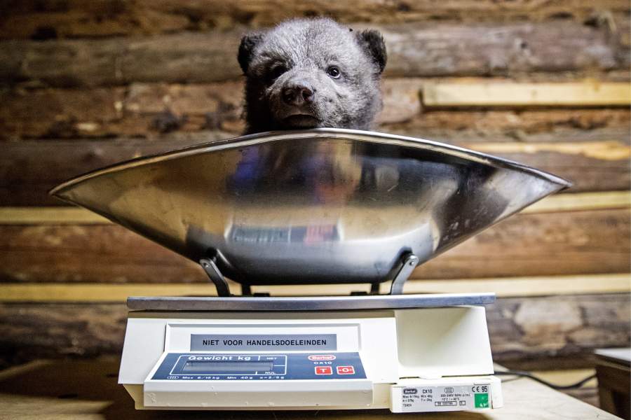 Один из подопечных Центра спасения бурых медвежат-сирот Международного фонда защиты животных (IFAW), расположенного в деревне Бубоницы Торопецкого района, во время взвешивания