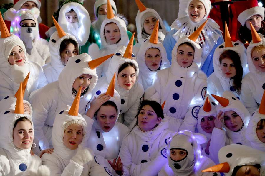 Многие вышли на улицу, переодевшись в карнавальные костюмы. В Москве, например, одним из самых популярных образов стал снеговик