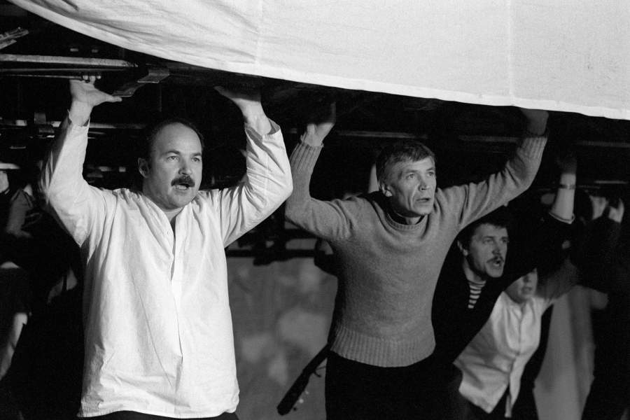 Сцена из спектакля «На дне» по пьесе М. Горького в постановке А. Эфроса в Московском театре на Таганке. Слева — Всеволод Соболев (Актер), справа — Иван Бортник (Сатин)