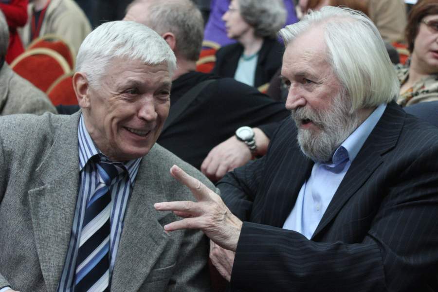 Россия. Москва. 31 марта. Актеры Иван Бортник и Станислав Любшин (слева направо) на Всероссийском чрезвычайном съезде Союза кинематографистов РФ в Гостином дворе