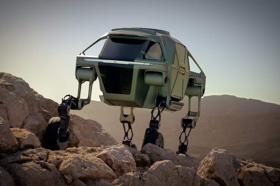 Самый необычный концепт выставки — вездеход Hyundai Elevate. По асфальту он передвигается на колесах, а на бездорожье приподнимается на коленчатых ногах. Каждая конечность имеет пять степеней свободы, благодаря чему прототип может двигаться в любую сторону, имитируя походку как четвероногого млекопитающего, так и рептилии. Это позволяет Hyundai Elevate передвигаться по самому сложному рельефу, легко перешагивая через полутораметровые препятствия