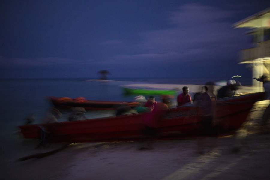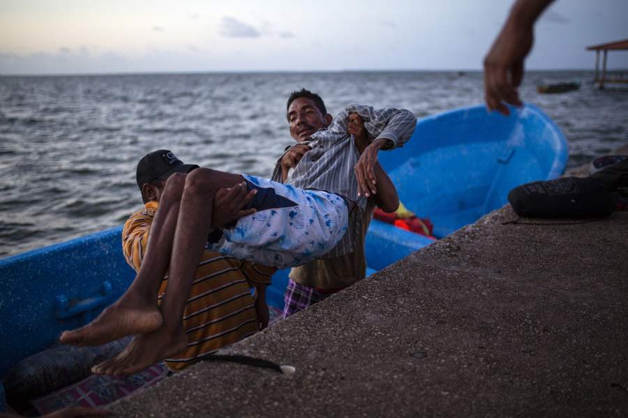 Ловцы лобстеров на побережье Мискито ждут, пока за ними придут лодки, которые доставят их на судно, — им предстоит двухнедельный рейс