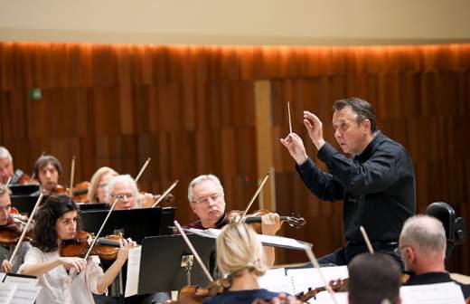 Контраст, как оказалось, был в другом. Один и тот же коллектив в первом и втором отделениях играл по-разному. Симфонией и сюитой дирижировал приглашенный маэстро Константин Хватынец, музыканты при этом располагались традиционно — полукругом. И несмотря на четкую жестикуляцию дирижера, взаимопонимания между ним и оркестром не было. Моцарт и Стравинский прозвучали несколько тяжеловесно, без присущих РНО и самим композиторам изящества и богатой нюансировки.