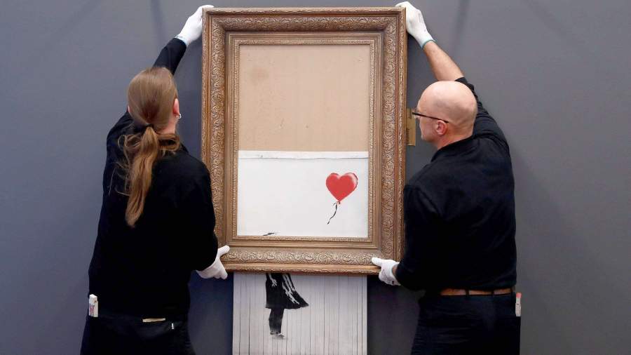 Картина «Девочка с шаром» была продана на аукционе Sotheby's в октябре 2018 года за £1,04 млн ($1,36 млн) и сразу же после удара молотка попала во встроенный в раму шредер, превративший треть картины в мелкие тонкие полоски. Покупательница тогда не стала отменять сделку, и полотно обрело новое название «Любовь в мусорной корзине», сообщает телеканал «Звезда». В настоящее время картина находится в долгосрочной аренде в музее Штутгарта, который и предоставил его для экспозиции в Баден-Бадене.